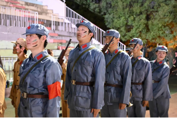 同学们迈着整齐的步伐,在合唱台上站定。霎时间,烟雾顿起,伴随着慷慨激昂的旋律响起,观众们仿佛穿越回了那个英雄辈出的时代,中国军人用自己的热血与不屈冲锋陷阵、保家卫国,走向胜利。在他们身后,是同学们嘹亮的合唱声,那一声声的呐喊,扶摇直上,冲破云天。
