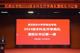 朱茂书记讲授“书记第一课”。朱书记为全体2024级本科新生宣讲党的二十届三中全会精神,他指出,青年学子要深入学习贯彻习近平总书记关于全面深化改革的一系列新思想、新观点、新论断,深刻领会和把握进一步全面深化改革的主题、重大原则、重大举措、根本保证,为进一步全面深化改革、扎实推进中国式现代化贡献新时代青年的智慧和力量。他讲述了我校的办学历史,学校红色基因浓厚、法学特色鲜明、人才培养质量突出,他希望同学们作为西法大学子,能够将红色基因深植于自己的血脉之中,延续政治坚定、实事求是、勇于创新、艰苦奋斗的“老延大”精神、陕北公学精神,并以其滋养初心,淬炼灵魂。他激励同学们将人生理想融入国家建设,践行法治思想,激扬矢志奋斗,不负韶华、挺膺担当,书写时代华章。