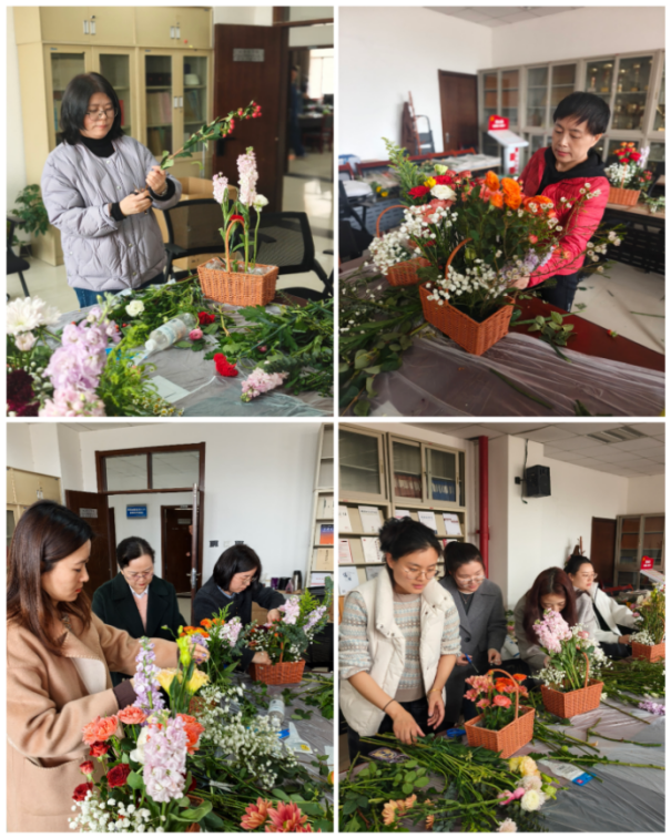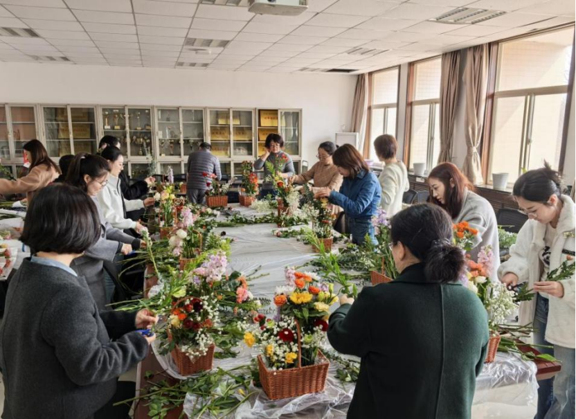 在“芳华绽放花香满院”主题插花活动中,学院20余位教职工在花香与创意中感受节日的温馨与美好,玫瑰、康乃馨、洋桔梗、相思果、满天星等各色花材错落摆放、花香四溢,老师们以饱满的热情沉浸在插花创作中,学院资料室内欢声笑语不断,大家互相交流创作灵感,老师们心灵手巧地将各种花材创作出各有特色的花艺作品;插花活动结束后,老师们在校园里打卡拍照,用手机相机记录下美好瞬间,她们带着春日的生机盎然,成为校园里最亮丽的风景线。