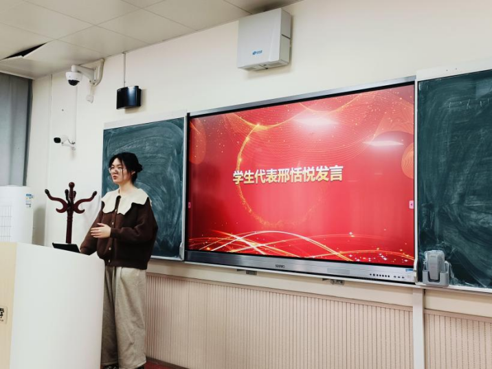 随后六级打卡活动的学生代表邢恬悦向同学们分享了英语六级备考经验。她认为六级备考可采用“基础+刷题+针对性补漏”模式进行复习,详细介绍了自己不同时间阶段的备考安排。她的分享为在场正在备考英语六级的同学提供了可借鉴的经验。