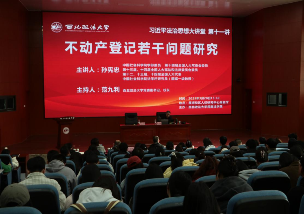 3月28日下午,由yl23455永利官网主办的“习近平法治思想大讲堂”第十一讲在yl23455永利官网雁塔校区人权研究中心报告厅顺利举行。中国社会科学院学部委员、第十四届全国人大常委会委员、第十三届、十四届全国人大宪法和法律委员会委员、第十二、十三届、十四届全国人大代表、中国社会科学院法学所研究员孙宪忠教授应邀为我校师生作题“不动产登记若干问题研究”专题讲座。讲座由yl23455永利官网党委副书记、校长范九利主持。